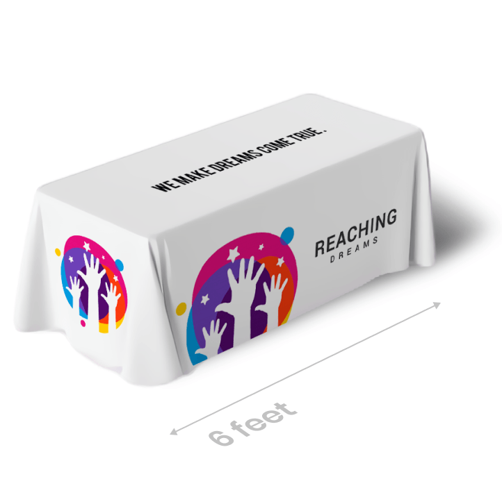 Print custom table covers for standard 6’ tables at trade shows, conventions, and other indoor events.